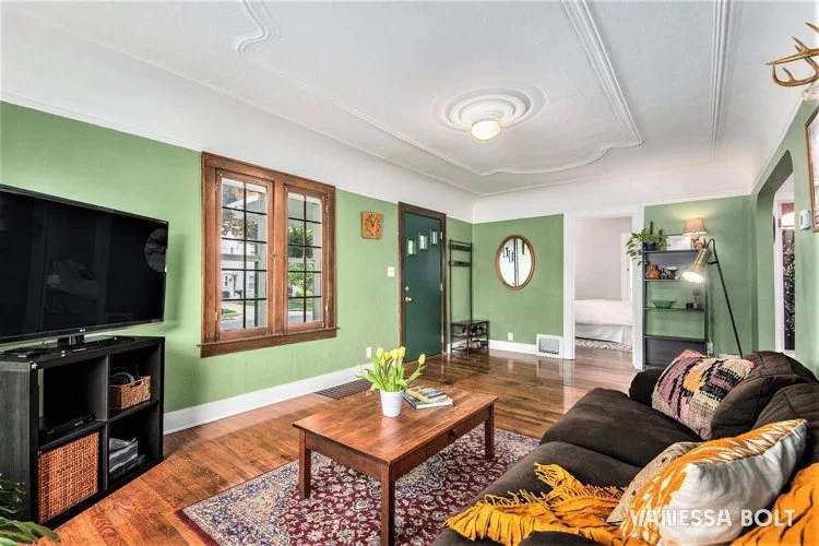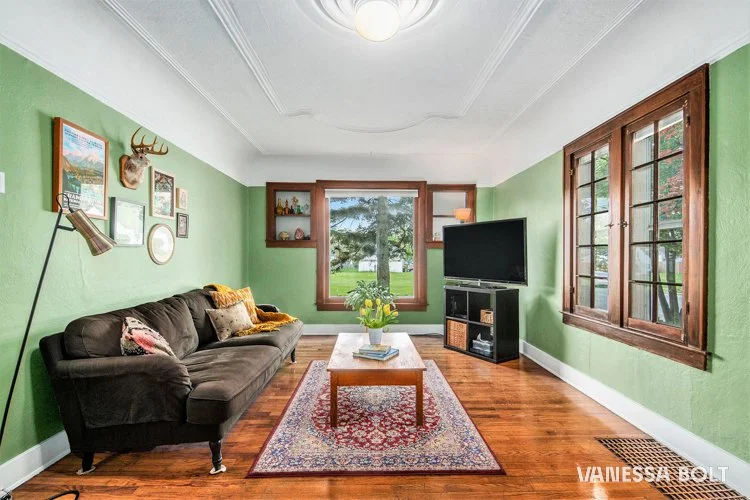 Beautiful hardwood floors, arched doorways, intricate plaster ceiling details in the living room, and original casement French windows that bring in natural light throughout the home. The kitchen has been refreshed with a tiled backsplash, butcher block countertops, newer stainless steel appliances, and updated vinyl flooring. Two bedrooms and a remodeled full bathroom complete the main level.